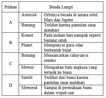 11. Ciri-ciri benda langit dalam tabel berikut yang benar adalah….